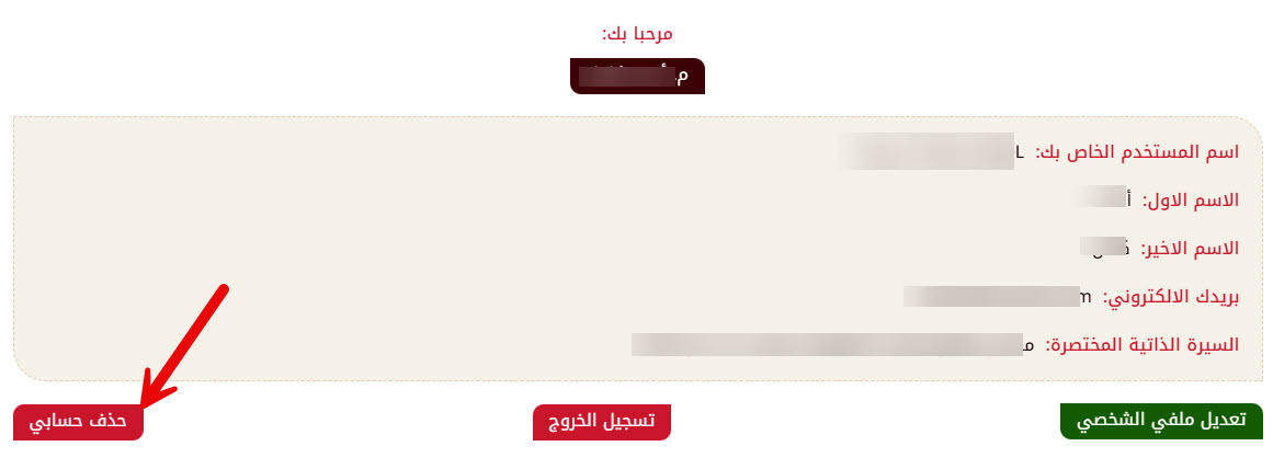 - يمكنك حذف حسابك وجميع بياناتك من خلال صفحة تحرير الملف الشخصي، والتي يمكن الوصول إليها من الشريط العلوي بعد تسجيل الدخول.